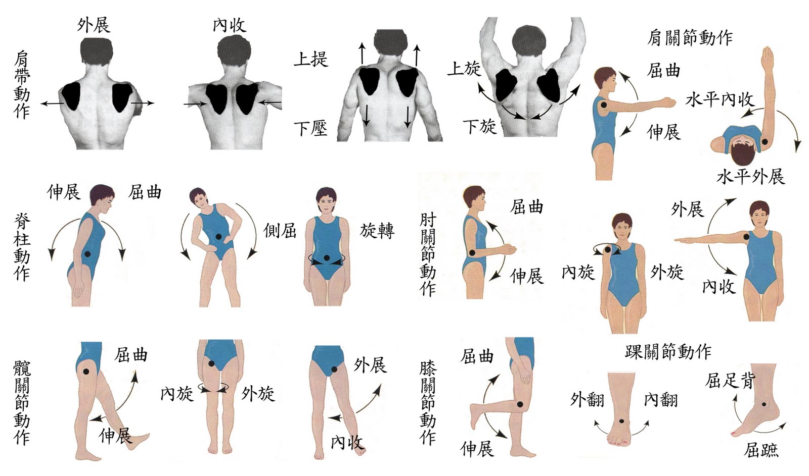 外展-闊筋膜張肌、臀中小肌 內收-內側肌群 外旋-深層旋轉肌肉群、臀大肌 內旋-內側肌群、臀中小肌
